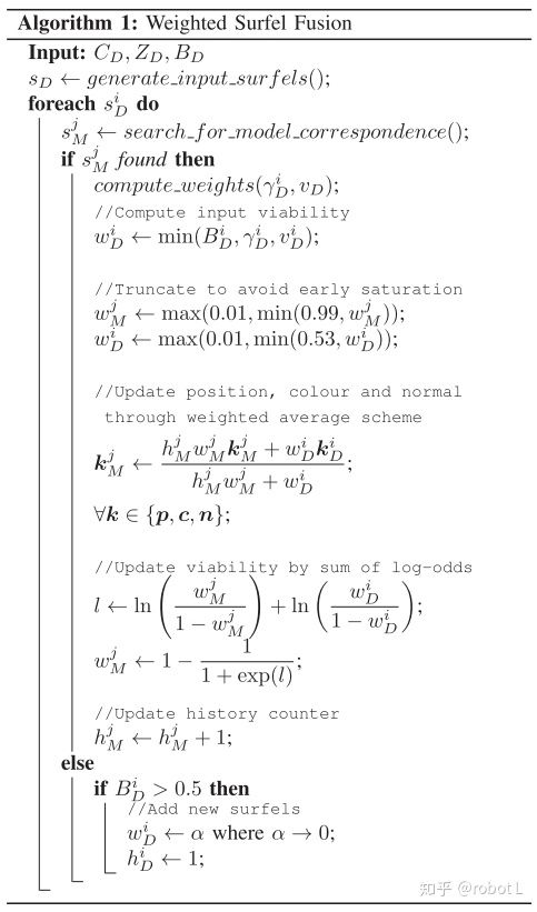 我们使用[1][4]中的预处理和数据关联方法。不同的是我们为每个面元新定义生存能力,用来移除与动态输入点匹配的面元。融合过程如算法1所示。
