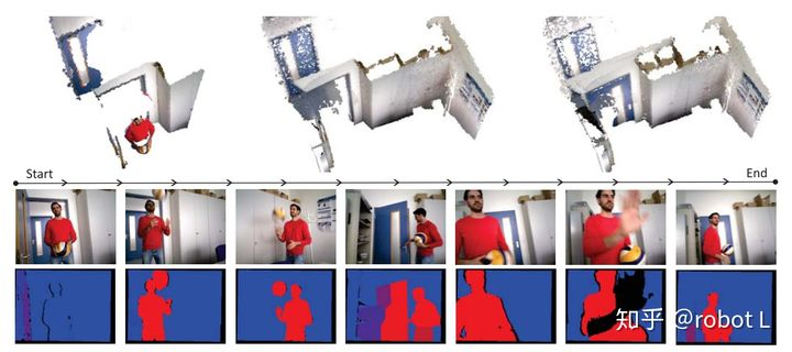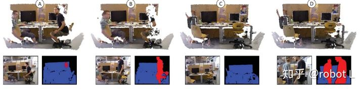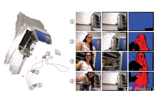 对于Keller等人[4],没有较近模型点对应的输入点被用于区域生长过程的种子点来分割当前图片为静态和动态部分。接着,与动态输入点匹配的模型点从重建中被移除。这种方法只有在对场景进行了有信心的重建之后才是有效的。