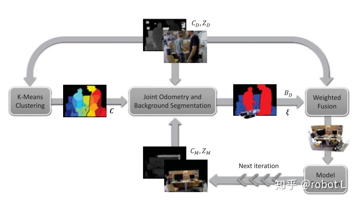 SOTA稠密视觉SLAM方法能够产生大型室内场景中令人印象深刻的重建。这些方法,然而,经常依赖环境是静态的假设,相机运动平滑并且场景中有充分的几何或纹理用于可靠的跟踪。我们专注于静态场景的假设。动态环境中的鲁棒操作是一个开放性问题。例如,大多数里程计方法执行当前图片和之前参考之间的配准,同时假设图片间被估计的变换是由相机运动导致的。动态元素然乱了该假设,并且可能导致位姿跟踪中的失败。此外,如果没有主动监测和分割,动态物体可能被融合到地图中,其可能导致不可逆转的损害。