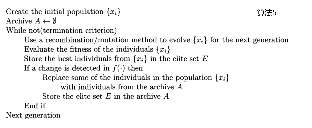 费用函数有时候会在函数的一个有限集中变化,这种变化是确定的而不是随机的。显式的基于记忆的方法是将好的个体存入档案。每次检测到费用函数发生变化时,就从档案中取回个体并把它们加入种群。如果费用函数变成之前曾遇到过的函数,档案中的个体就是好的解进而进化算法非常迅速地收敛到新的最优值。算法5说明这个方法,但只是一个基本的概述。