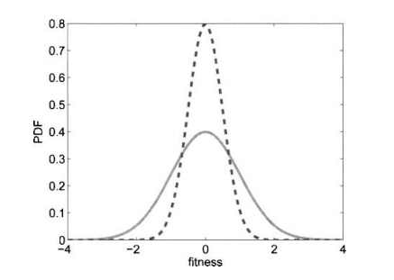 其中,f(x)是真实的适应度,w是方差为的零均值噪声。这意味着测量到的适应度值g(x)的均值为f(x),方差为
