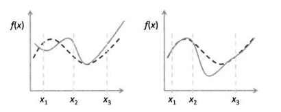 假设有一个适应度函数f(x),我们已经在M个个体上对它做了评价。可以利用这M个函数值估计搜索空间中任一点的适应度。下图说明适应度估计的基本思路,基于已知的函数值