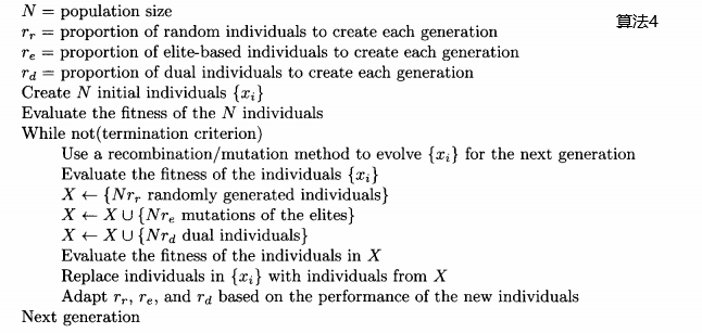 ?如算法4所示,可以对它们进行调整以改善算法的性能,但这样会让算法更复杂。下面的调整方案:在每一代评价新个体的适应度,如果随机个体的那一组表现得比对偶和精英个体好,就做入下调整:
