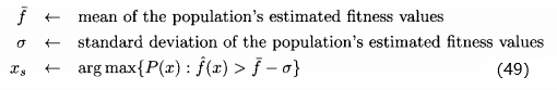 的值。这个式子说明,适应度估计值大于均值一下一个标准差的所有个体中,选择不确定性最大的个体重新评价。这个策略假定f(x)为适应度,所以f(x)越大越好。