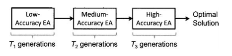 较少适应度评价次数的另一个方法是在进化算法开始时只做几次采样,在进化算法运行过程中经常的在采样。这样做的道理是,在优化过程初期,进化算法的搜索通常比较粗糙。在早期的代中进化算法试图找到最优解的一个大致的邻域;在后期的代中则试图收敛到更准确的解。当进化算法开始收敛,优化过程快结束,我们才需要更精确的适应度函数值。也就是说,只有在准确度较好的情况下准确度才有意义。