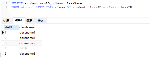 FROM student LEFT JOIN class ON student.classID = class.classID;