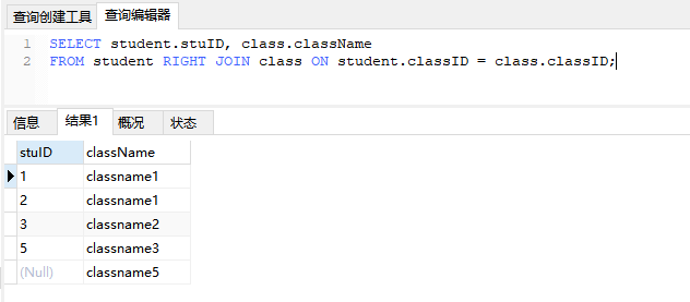 结果表中包含“右表”的全部记录,左表中不存在的数据用NULL来代替,class是“右表”,SQL 语句如下。