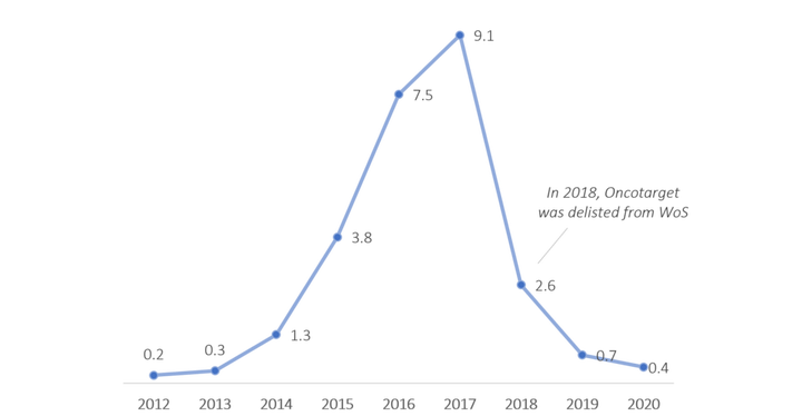 图4. Oncotarget的年度论文量(k)数据来源于Dimensions数据库