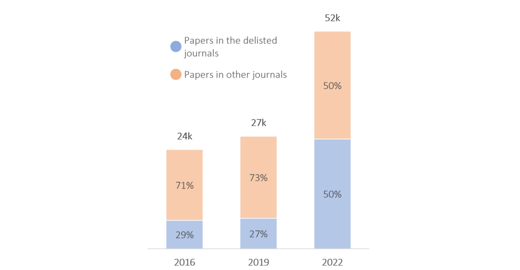 图5. Hindawi被剔除期刊所发表的论文数及在总论文中的占比;数据来源于出版商网站和Dimensions数据库