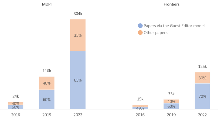 图1. MDPI和Frontiers通过客座编辑模式发表的论文数量以及在总论文中的占比;数据来源于出版商网站