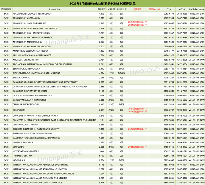 以下整理的是Web of Science数据库中2023年3月最新Hindawi在检的SCI&SSCI期刊名单,以供参考: