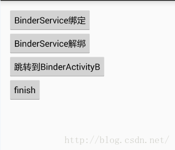 <LinearLayout xmlns:android="http://schemas.android.com/apk/res/android"xmlns:tools="http://schemas.android.com/tools"android:layout_width="match_parent"android:layout_height="match_parent"android:paddingBottom="@dimen/activity_vertical_margin"android:paddingLeft="@dimen/activity_horizontal_margin"android:paddingRight="@dimen/activity_horizontal_margin"android:paddingTop="@dimen/activity_vertical_margin"android:orientation="vertical"tools:context="com.hh.servicedemo.MainActivity"><Buttonandroid:id="@+id/btn1"android:layout_width="wrap_content"android:layout_height="wrap_content"android:text="BinderService绑定"/><Buttonandroid:id="@+id/btn2"android:layout_width="wrap_content"android:layout_height="wrap_content"android:text="BinderService解绑"/><Buttonandroid:id="@+id/btn3"android:layout_width="wrap_content"android:layout_height="wrap_content"android:text="跳转到BinderActivityB"/><Buttonandroid:id="@+id/btn4"android:layout_width="wrap_content"android:layout_height="wrap_content"android:text="finish"/></LinearLayout>