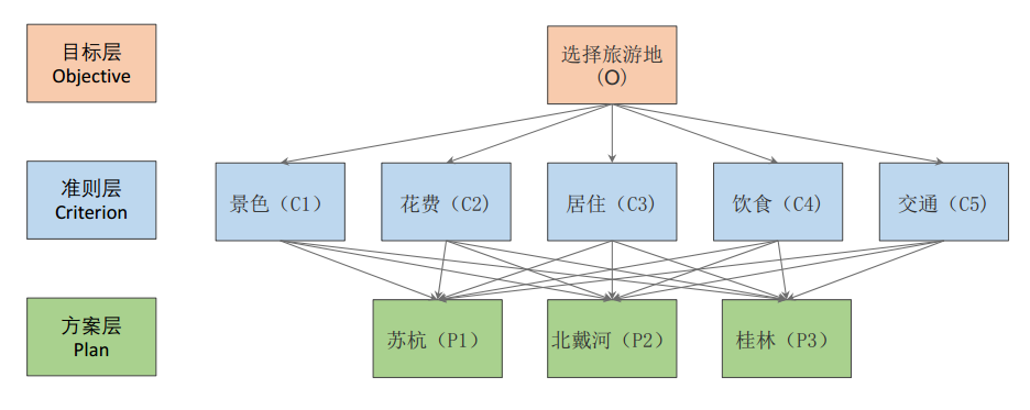2.评价指标(准则层)?(查阅资料后)景点景色、旅游花费、居住环境、饮食情况、交通便利程度。
