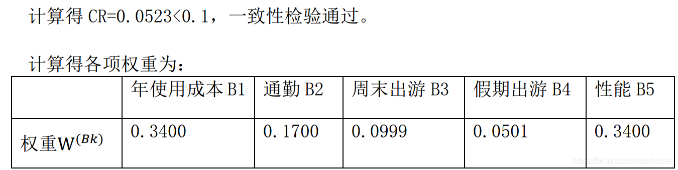 但在绝大多数情况下成为严格的一致矩阵不太可能,因此可以规定某个偏离范围,即使偏了一点也行,但不能偏太大,就有了一致性检验。(这块直接跑现成的程序出结果就行了,不介绍计算过程了)