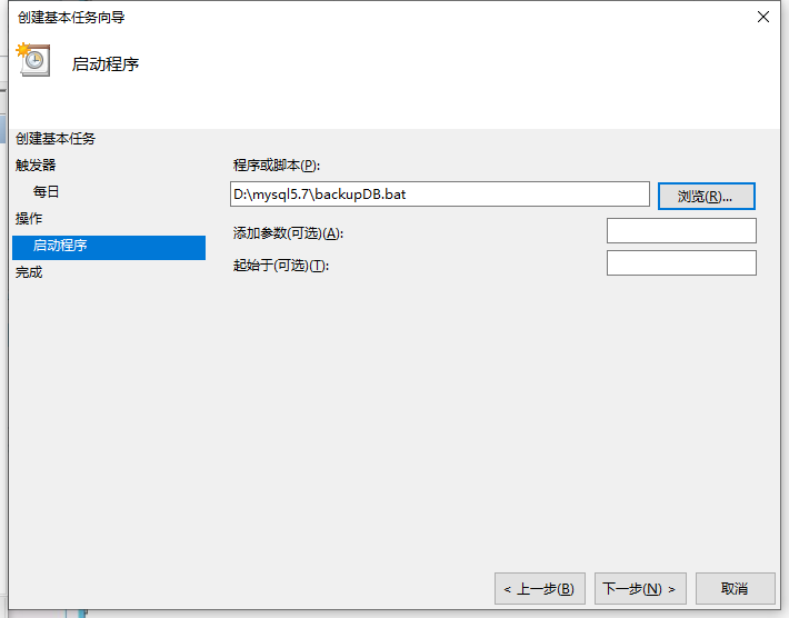 5、选择执行的操作,选择启动程序,执行的是事先测试过的一个.bat脚本;