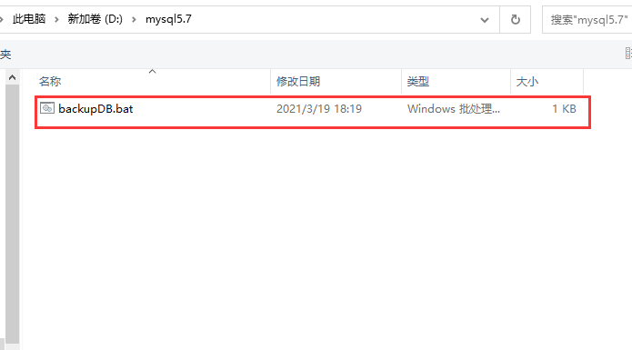 2、将mysql5.7文件夹放置D盘,双击backupDB.bat ,此时D盘会生成一个backupDB文件夹,备份数据库自动生成;(如果数据库较大,需要等几分钟)