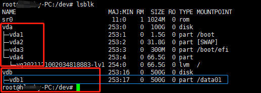 3、输入 lsblk 命令,查看vdbb磁盘下是否已挂载,含有/dev/vdb1、/dev/vdb2、/dev/vdb3、/dev/vdb4 时,确认为该磁盘有被挂载(挂载磁盘大小查看后,可以确认是否被使用完),如下图所示: