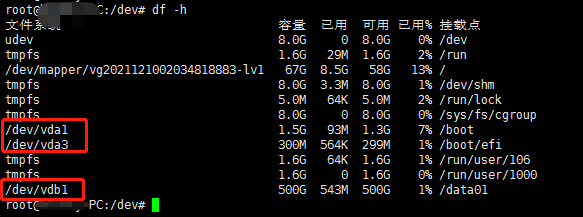 2、输入 df -h 命令,查看上面查询到的磁盘是否挂载,没有/dev/vdb1、/dev/vdb2、/dev/vdb3、/dev/vdb4 时,可以认为是未挂载。