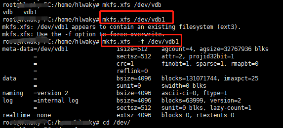 如上图所示,若前后格式不一致时,若要强制格式化,可以使用 -f 参数,即 mkfs.xfs -f /dev/vdb1 命令。