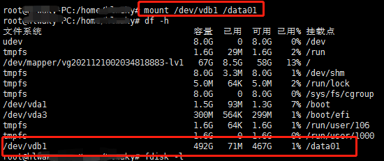 输入 mount /dev/vdb1 /data01 命令,进行挂载,如下图所示: