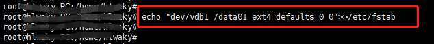 输入 echo “/dev/vdb1 /data01 xfs defaults 0 0 ” >> /etc/fstab 语句,将挂载信息写入配置文件中,这样服务器重启后,磁盘怪哉信息还在,如下图所示: