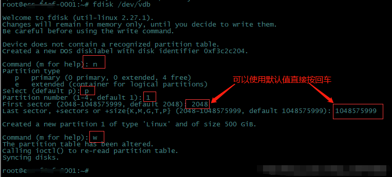 依次输入 n、p、1、回车键、回车键、w ,如下图所示: