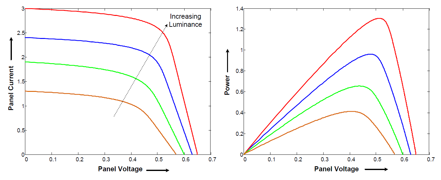 由上一节关系式可以得到光伏特性曲线,左图为不同光照强度下电流随电压变化的图形,右图为功率随电压变化的图形:
