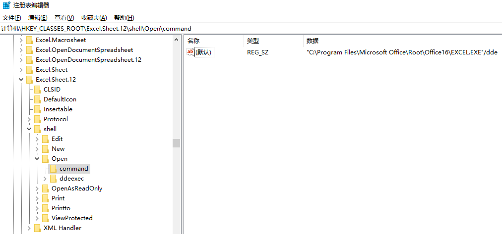2、对HKEY_CLASSES_ROOT\Excel.Sheet.12\shell\Open\command项默认值进行修改(点击“默认”,右键,选择 修改)