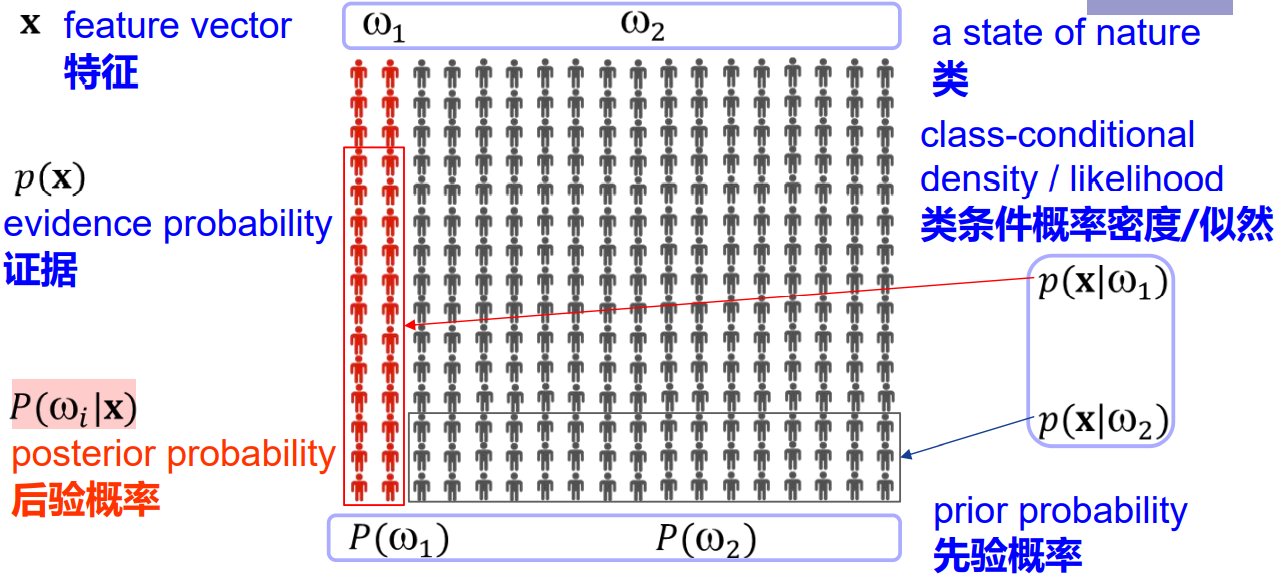 假设我们要对一种物体进行分类,只根据它的先验概率p(w)分类是不现实的,若某种类型的先验概率较大,那么几乎所有物体都会被判别为那种类型,这显然是错误的。
