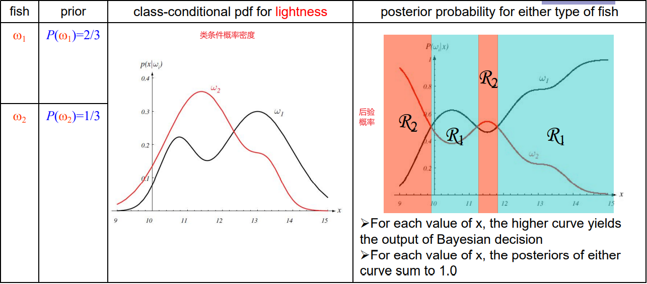 为了更好的进行分类,我们观察事物的一些特征X,例如对于鱼分类——鱼的光泽程度,对西瓜分类——西瓜的颜色。统计了关于特征x的类条件概率密度。根据贝叶斯公式: