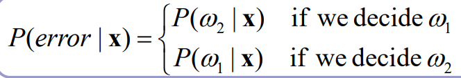 根据第2节的内容,如果有某个观测值x使得 我们自然的会做出真实类别是w1的判断,我们计算做出某次分类判决时的误差概率:
