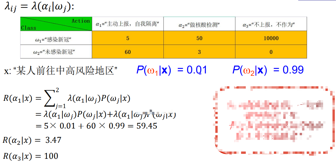 因此我们得出最小化风险决策的贝叶斯决策规则:为了最小化总风险,对所有的 i = 1,2...,a 计算条件风险: 并且选择