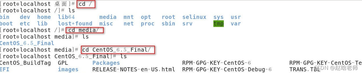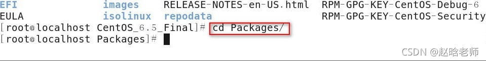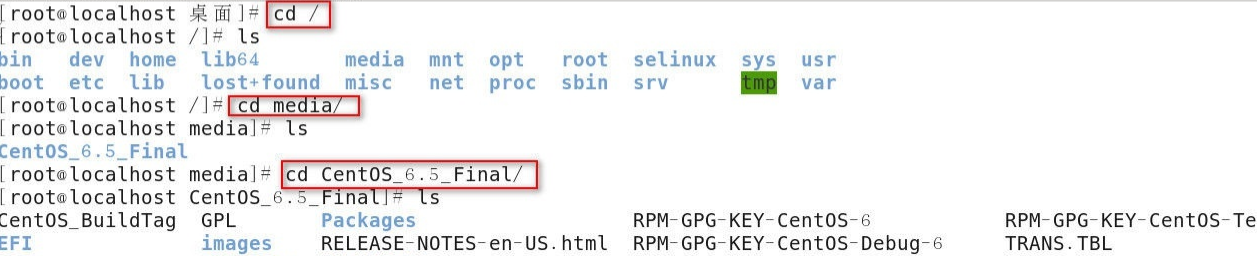 2)默认情况下光盘挂载在/media目录下,所以安装软件包时,必须进入到软件包的当前目录/media/CentOS_6.5_Final/Packages目录中才可以安装,安装的软件存放在光盘上,,如果安装软件包时,当前目录是桌面,那么进入Packages目录的步骤如下: