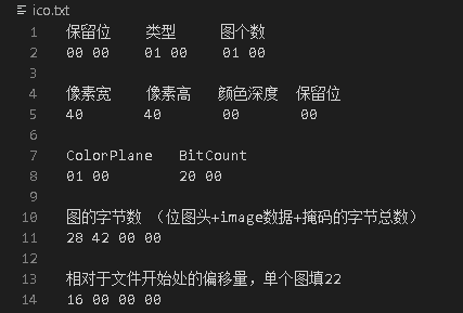 {BYTE bWidth; // 图片的像素宽度BYTE bHeight; // 图片的像素高度BYTE bColorCount; // 颜色深度:=1<<(wBitCount×wPlanes),如果大于等于8就为0;但是可以不管,填0就行BYTE bReserved; // 保留位必须为零WORD wPlanes; // Color Planes,我填的1WORD wBitCount; // Bits per pixel,我填的32DWORD dwBytesInRes; //该图字节数(位图头+image数据+掩码的字节总数)DWORD dwImageOffset; //相对于文件开始处的偏移量,单个图填22,毕竟icon头加起来22字节