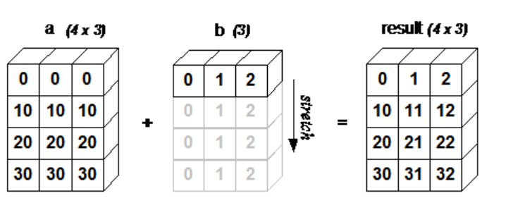 ndarray 对象由计算机内存的连续一维部分组成,并结合索引模式,将每个元素映射到内存块的一个位置。
