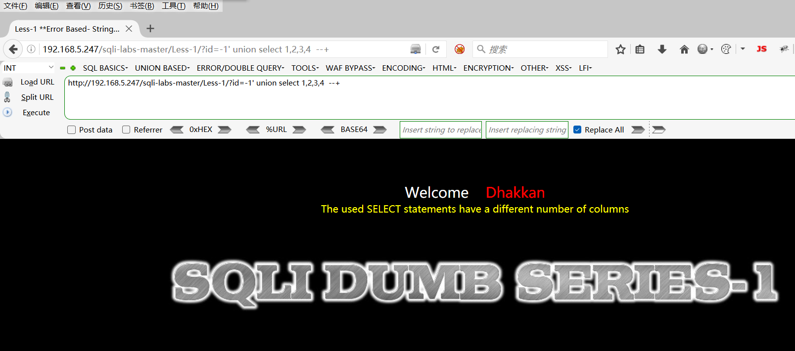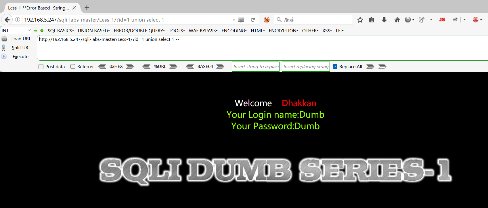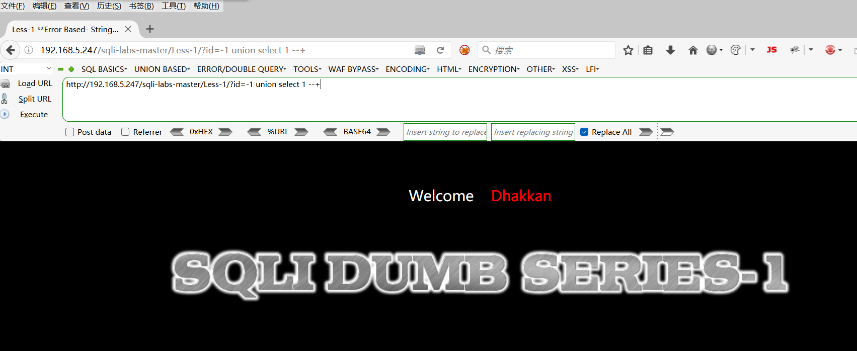 http://192.168.5.247/sqli-labs-master/Less-1/?id=1 union select 1 --+