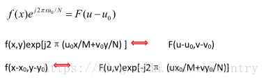 在频域中原点平移到(u0 ,v0)时,其对应的空间域 f(x,y)要乘上一个正的指数项: