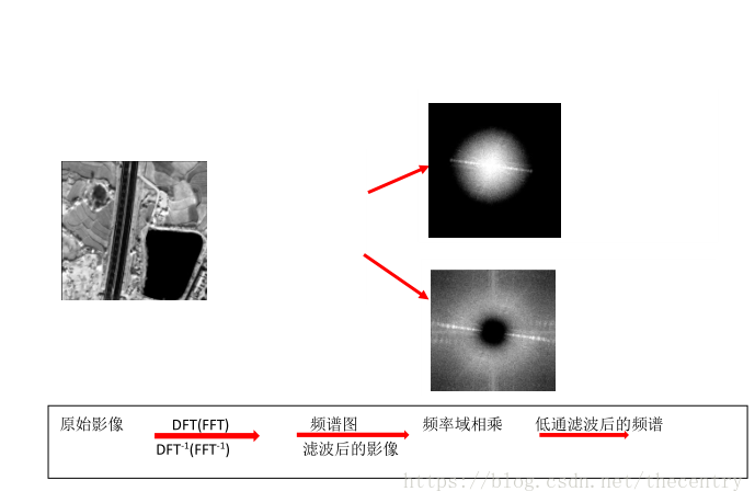 根据空间域卷积定理,在空间域对应的是原始信号与滤波器的冲击响应的卷积,卷积定义式为信号翻折平移求和的过程,步骤复杂,运算量大,但如果转换到频率域进行处理,则对在将二者的频谱直接相乘就可以得到滤波结果,然后对滤波结果进行傅里叶逆变换就可以得到滤波后的空间域域图像。如下图所示,对信号进行低通和高通滤波处理的过程和效果。