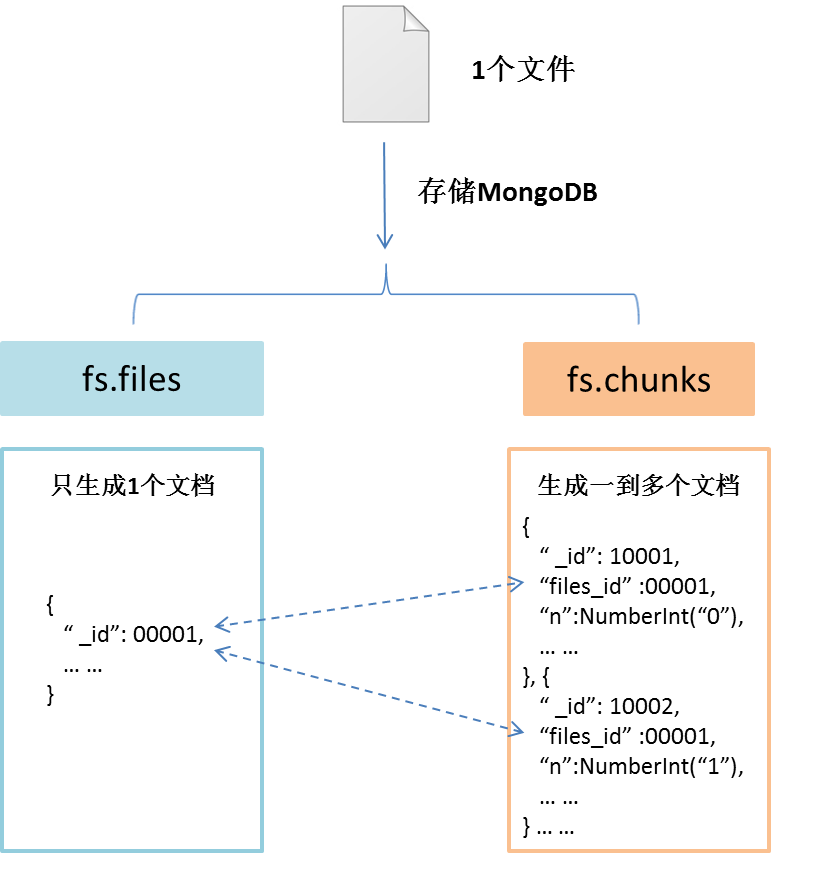 GridFS使用两个集合(collection)存储文件。一个集合是chunks, 用于存储文件内容的二进制数据;一个集合是files,用于存储文件的元数据。GridFS会将两个集合放在一个普通的buket中,并且这两个集合使用buket的名字作为前缀。MongoDB的GridFs默认使用fs命名的buket存放两个文件集合。因此存储文件的两个集合分别会命名为集合fs.files ,集合fs.chunks。当然也可以定义不同的buket名字,甚至在一个数据库中定义多个bukets,但所有的集合的名字都不得超过mongoDB命名空间的限制。