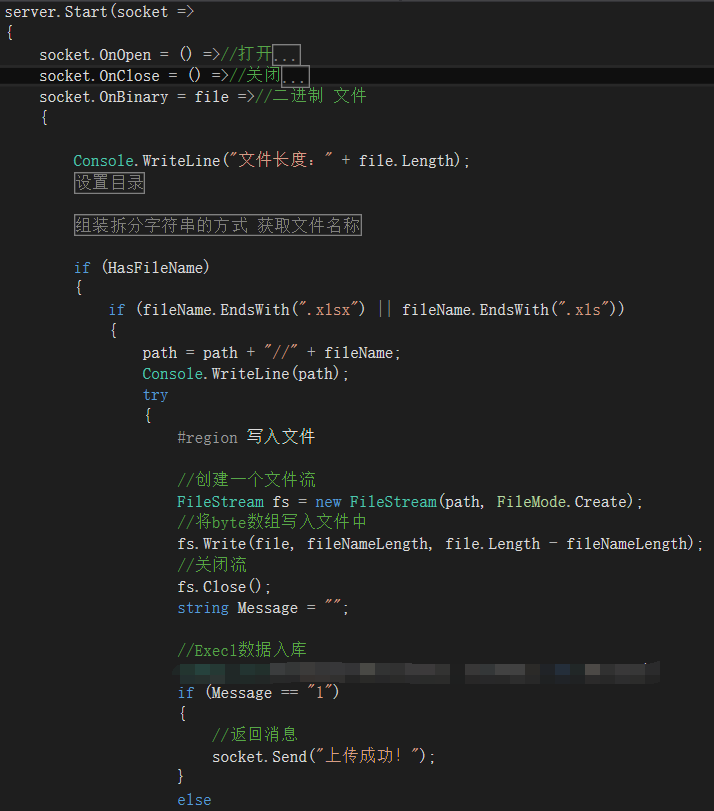 网上很多Fleck的例子,server.Start 中只需要加上 socket.OnBinary = file =>{......},具体后面有图。