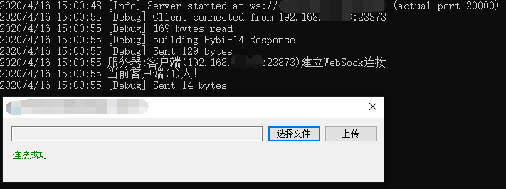 /// <summary>/// 上传文件/// </summary>async void UpFile(){if (ws.State == WebSocketState.Open){// 用文件流打开用户要发送的文件;using (FileStream fs = new FileStream(txtSelectFile.Text, FileMode.Open)){//获取文件的名称和扩展名 string fileName = System.IO.Path.GetFileName(txtSelectFile.Text);//文件的名称转byte[] 利用了web上面url编码的功能,带了编码,避免二进制过来汉字乱码byte[] arrfileName = System.Web.HttpUtility.UrlEncodeToBytes(fileName, Encoding.GetEncoding("GB2312"));//string//分隔符byte[] arr_fgf = System.Text.Encoding.UTF8.GetBytes("|");//定义数组 赋值计算总长度byte[] arrFile = new byte[fs.Length + arrfileName.Length + arr_fgf.Length];//组装字符串的方式//把arrfileName复制到arrFileArray.Copy(arrfileName, arrFile, arrfileName.Length);//把arr_fgf复制到arrFile,在arrfileName之后Array.Copy(arr_fgf, 0, arrFile, arrfileName.Length, arr_fgf.Length);//把文件流写入arrFile指定位置fs.Read(arrFile, (arrfileName.Length + arr_fgf.Length), (arrFile.Length - arrfileName.Length - arr_fgf.Length)); // 将文件中的数据读到arrFile数组中;//以二进制方式发送WebSocketvar buffer = new ArraySegment<byte>(arrFile);await ws.SendAsync(buffer, WebSocketMessageType.Binary, true, CancellationToken.None);//清理控件txtSelectFile.Clear();//while (true)//{ArraySegment<byte> bytesReceived = new ArraySegment<byte>(new byte[100]);//接收数据WebSocketReceiveResult result = await ws.ReceiveAsync(bytesReceived, CancellationToken.None);//byte[]转stringvar str = Encoding.UTF8.GetString(bytesReceived.Array, 0, result.Count);//if (str.Length > 0)//{if(str.Contains("上传成功"))label1.ForeColor = System.Drawing.Color.Green;elselabel1.ForeColor = System.Drawing.Color.Red;label1.Text = str;// return;//}//}}}}