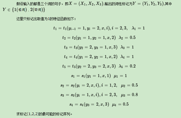 下面用一个具体的例子来描述 linear-CRF模型维特比算法,例子的模型来源于《统计学习方法》。