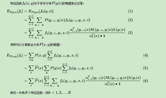回到特征函数本身,每个特征函数定义了一个linear-CRF的规则,则其系数定义了这个规则的可信度。所有的规则和其可信度一起构成了linear-CRF的最终的条件概率分布。