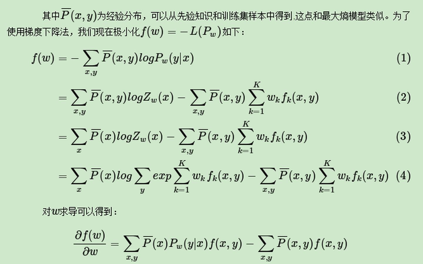 求解这个问题有很多思路,比如梯度下降法,牛顿法,拟牛顿法。也可以使用最大熵模型中使用的改进的迭代尺度法(improved iterative scaling, IIS)来求解。