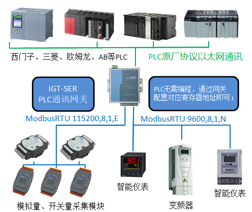 案例是通过一个IGT-SER智能网关,实现远程IO模块、智能仪表,变频器与PLC通讯。不同品牌的PLC之间通讯