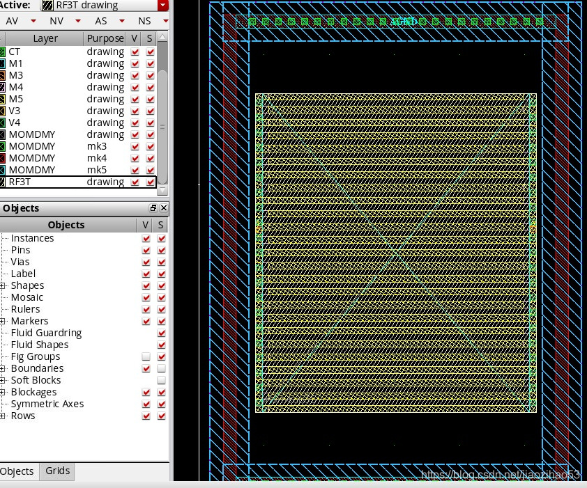 如图,一般三端MOM是做在N阱里,这样能有效的隔离衬底噪声。周围一圈蓝色用来做N阱接触,通过SN注入+AA有源区,形成一个可以做欧姆接触的环形区,顶层用M1和CT将该N阱接地。