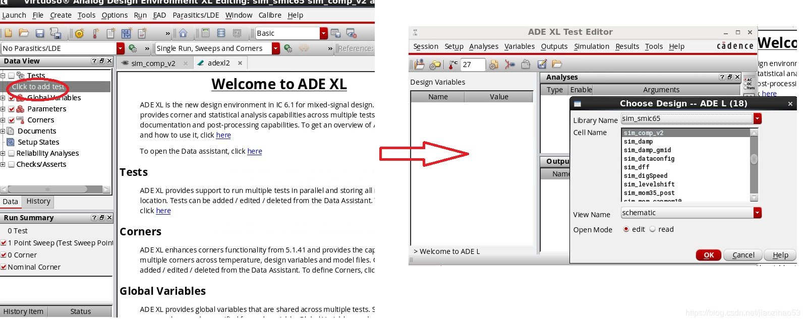 ②初次打开ADE XL会让创建一个new view,点击确定后在如下界面中单击“click to add test”指定仿真电路图,点击确定,如下图。