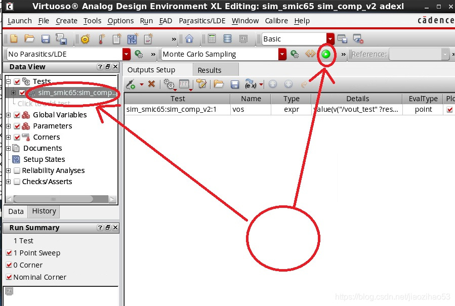 点击绿色按钮即可仿真,如果仿真失败,去②中打开的ADE XL里设置mc模型。